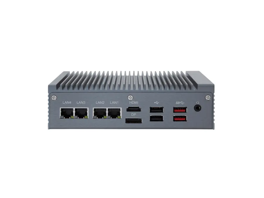 Specifikace: Barebone systém bez ventilátoru, Intel Celeron Elkhart Lake J6412, 4 x LAN, 2 x COM, 4 x USB, 1 x HDMI, 1 x DP, DC 12-24V napájecí vstup