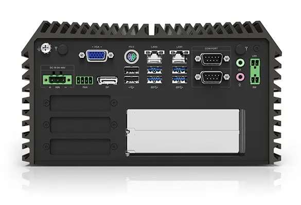 • I/O porty: 2× RS-232/422/485 (s napájením 5 V/12 V), 2× USB 3.2 Gen2, 4× USB 3.2 Gen1, 2× USB 2.0, PS/2, DIO, Line-in/Line-out/Mic-in