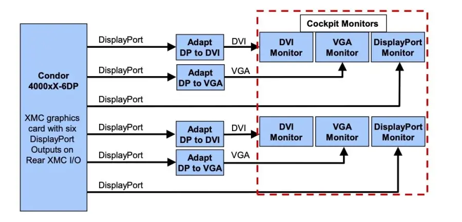 Například grafická karta Condor 4000xX-6DP XMC má na zadních vstupech a výstupech XMC k dispozici šest výstupů DisplayPort™.
