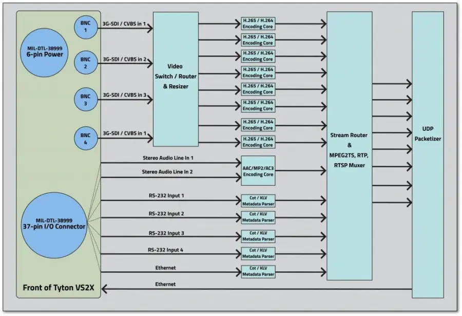 | Four 3G/HD/SD-SDI with VANC KLV Metadata (75 Ohm BNC) Four CVBS (NTSC / PAL / SECAM / RS-170 one wire) Two Stereo Audio R/L (37-pin circular MIL spec connector) Four RS-232 for CoT/KLV Metadata (37-pin circular MIL spec connector)