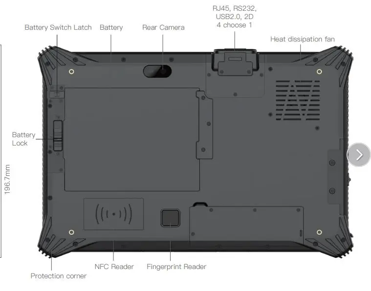 Rugged Tablet PC with i5-1235U, 16 GB DDR4L, 128 GB Flash, WIFI 802.11(a/b/g/n/ac) 2.4+5 GHz, BT 5.1, G-Sensor, LTE FDD: B1/B3/B7/B8/B20/B28A WCDMA: B1/B8 GSM: B3/B8, GPS, Camera Front 2.0 Mpx,Rear 8.0 Mpx