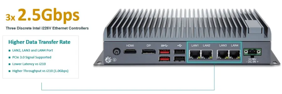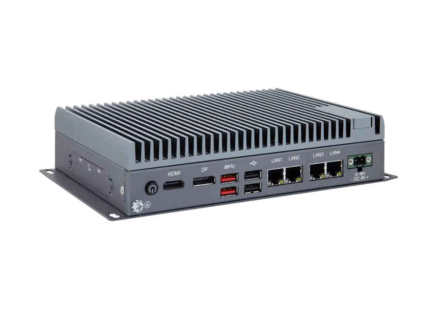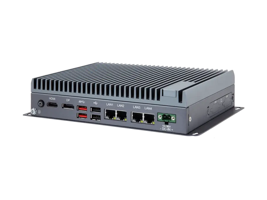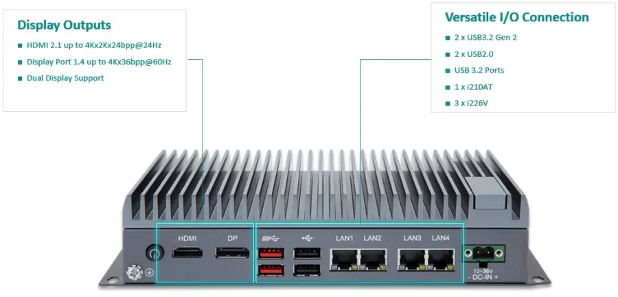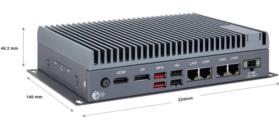 Barebone fanless system, Intel Core™ i3-N305 processor, 4xLAN, 4xCOM (up to 6), 6xUSB, 1xHDMI, 1xDP, DC12-36V power input.