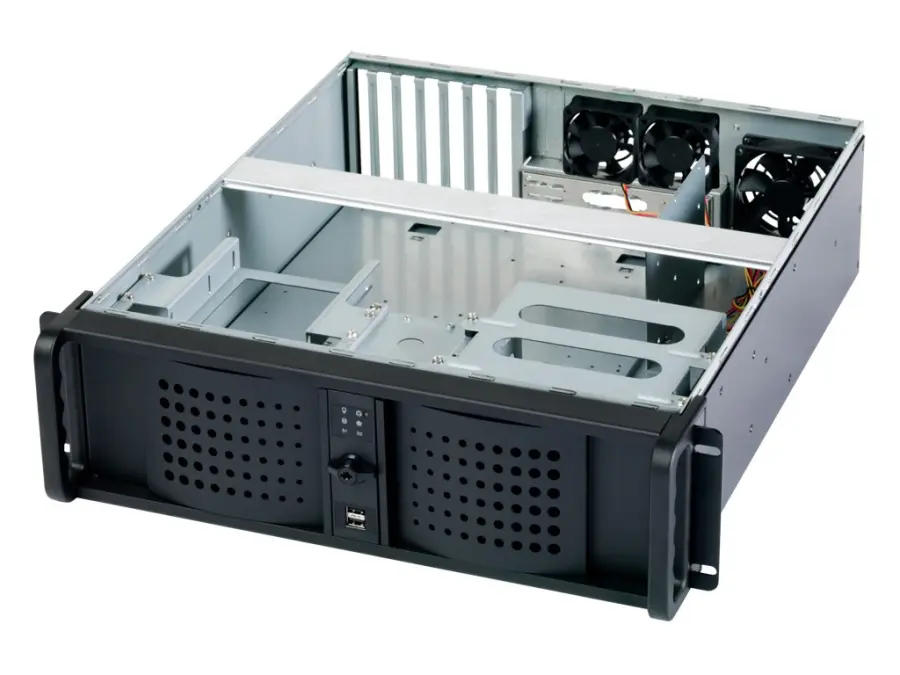 Racková skrinka 3U IPC 528mm. Vhodná pre základné dosky ATX (12" x 9,6"), šachty 2x 5,25'' + 1x 3,5'' vonkajšie, 5x 3,5" interné, chladenie 1x 80mm a 2x 60mm vzadu, uzamykateľné predné dvierka, vymeniteľné a umývateľné prachové filtre, zabudovaný reproduktor, 2x USB konektor vpredu, rozmery 482,6 x 528 x 132,6 mm, bez zdroja, bez kolajníc