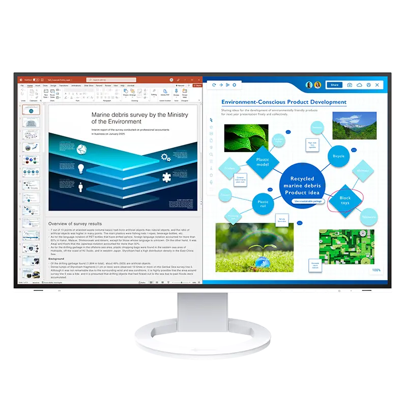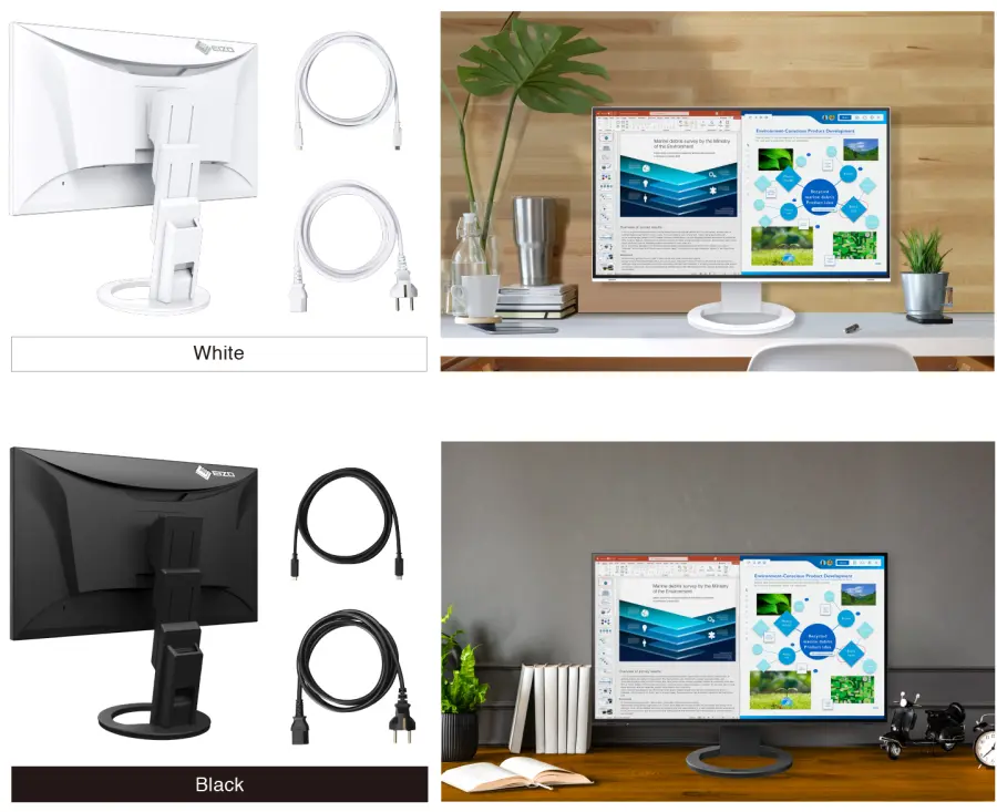 Kromě elegantní černé barvy je monitor k dispozici rovněž v bílé, která působí více minimalisticky. Společnost EIZO navíc poskytuje kabely stejné barvy jako monitor, pro co nejestetičtější vzhled.