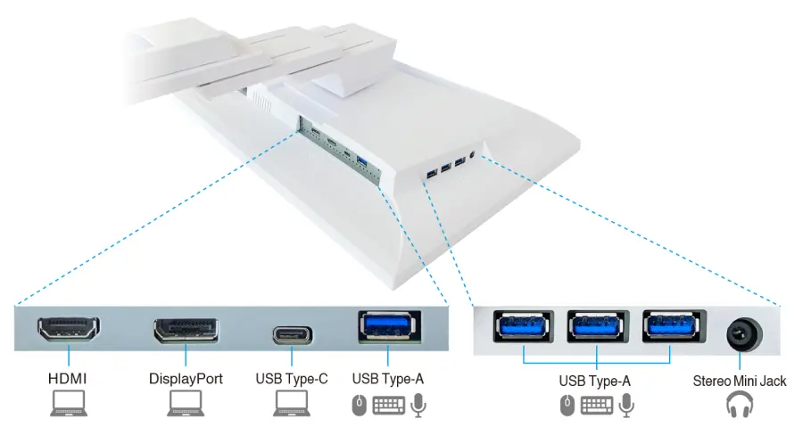 Monitor je vybaven USB-C, DisplayPortem a dvěma HDMI porty pro snadné připojení několika zařízení současně. Všechny porty ze zadní strany monitoru jsou snadno přístupné a umístěné tak, aby byly vždy na dosah ruky.