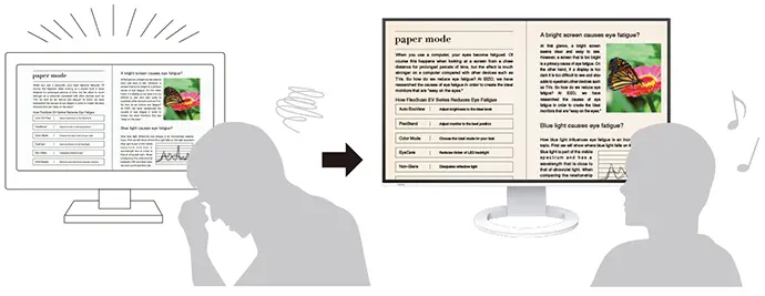 Ve viditelném spektru světla má modré světlo vlnové délky blízké ultrafialovému. V porovnání s továrním nastavením typických LCD monitorů snižuje „Paper Mode“ množství modrého světla, které je příčinou únavy očí, a pomáhá jí předcházet při čtení dokumentů. Při použití ve spojení s funkcí automatického stmívání „Auto EcoView“ lze modré světlo snížit až o 80 %.