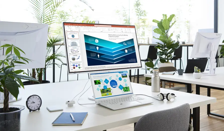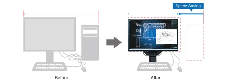 Monitor je vhodný i do menších prostor díky bezrámečkovému provedení, a malému stabilnímu stojanu, který nezabírá moc místa. I při umístění na malý stůl zůstane dostatek prostoru pro pohodlnou práci.