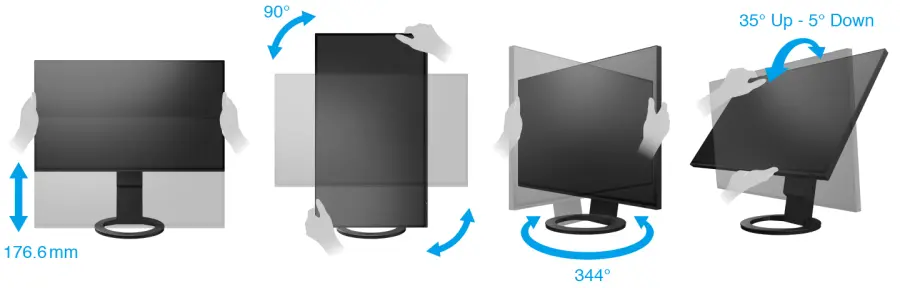Stojan má široké možnosti nastavení výšky, náklonu a otočení. Díky tomu si můžete monitor nastavit přesně tak, jak vám vyhovuje nejvíce. Monitor lze zvednout až o 176,6 mm a můžete si tak pod něj pohodlně umístit notebook nebo tablet.