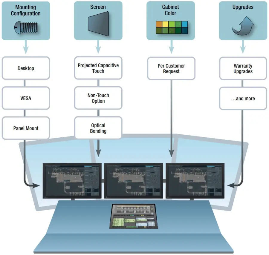 Aby splňovaly požadavky jakékoli instalace, nabízejí věžové monitory EIZO několik konfigurací, například montáž na panel pro instalaci přímo do konzoly nebo VESA pro montáž na rameno nebo stojan. Možnosti montáže se liší podle modelu.