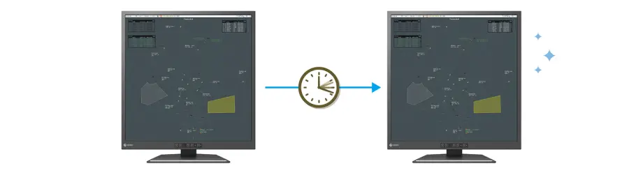 Jedinečná funkce zobrazení posledního snímku společnosti EIZO rozpozná, zda došlo k přerušení videosignálu, a automaticky zobrazí poslední dostupný snímek zachycený z vizuálního systému doplněný textovým překryvem, který informuje řídícího letového provozu o stavu.
