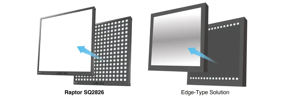 Monitor Raptor SQ2826 je vybaven systémem přímého podsvícení, který ve srovnání s okrajovými řešeními nabízí lepší rovnoměrnost jasu. To zajišťuje konzistenci způsobu zobrazení obrazu a umožňuje LED buňkám pracovat s vyšší účinností po celou dobu dlouhé životnosti monitoru.