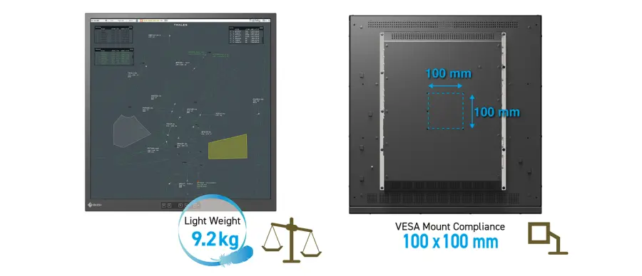 Je to první 2K monitor na světě pro ATC, který díky své nízké hmotnosti pouhých 9,2 kg splňuje montážní standardy VESA 100 x 100.