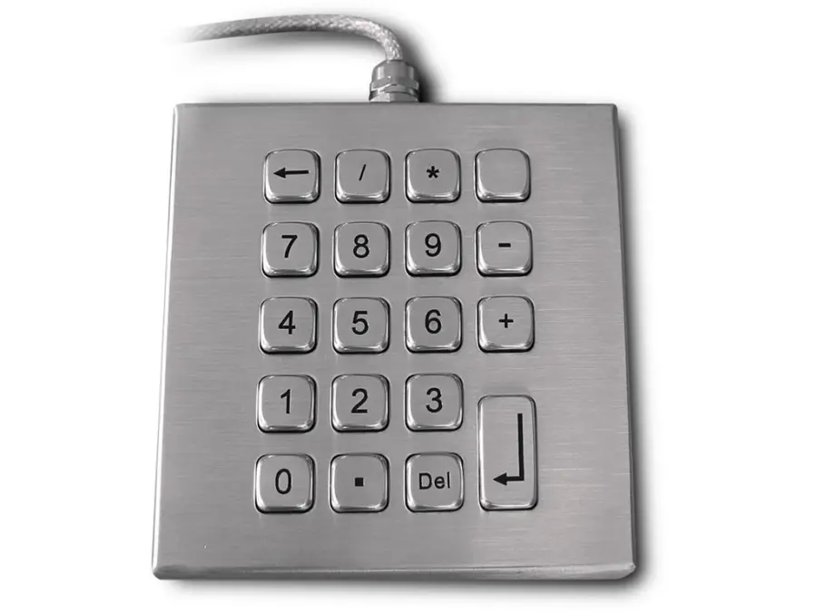 19 klávesová numerická klávesnice v kompaktním formátu. Krytí IP67 dynamické, vyrobeno z nerezové oceli v antivandal úpravě. Provedení v odolném "vandal proof" standardu s průmyslovým stíněním PCB řadiče (chráněno nerezovým krytem). Klávesy s dlouh