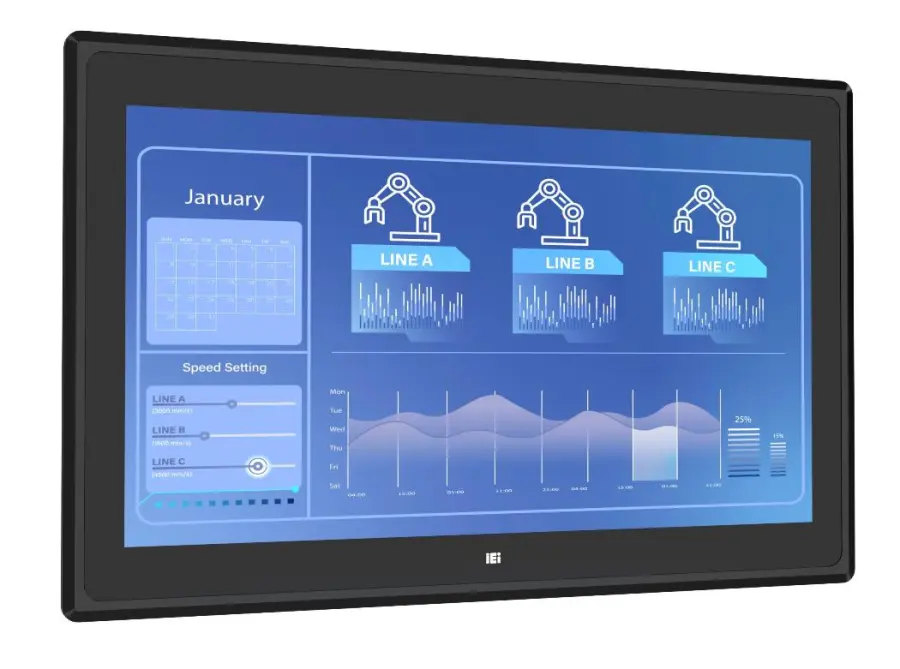 The IEI industrial panel computer has a 21.5" LCD display at 1920x1080 (16:9) resolution. Maximum luminance is 350 cd/m2. And it is also a touch panel.