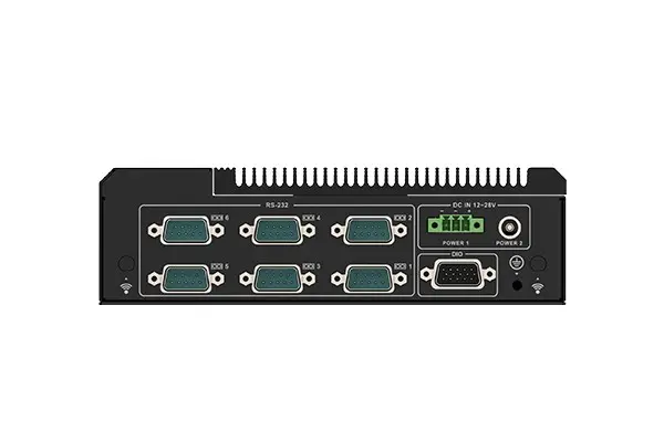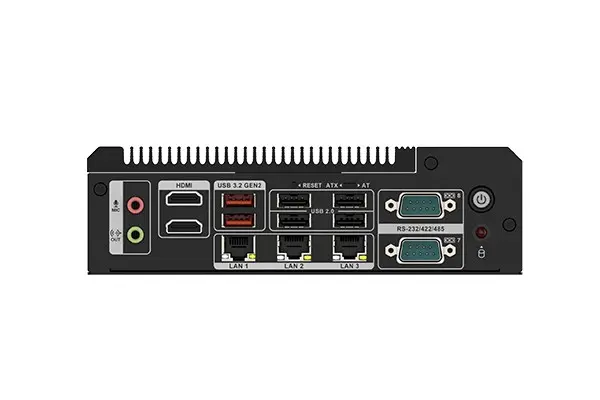 Bezventilátorový systém s procesorem Intel® Celeron® J6412, 8 GB DDR4, napájením 10–28 V DC, 8× COM, 6× USB, 2× HDMI a 3× 2,5GbE LAN