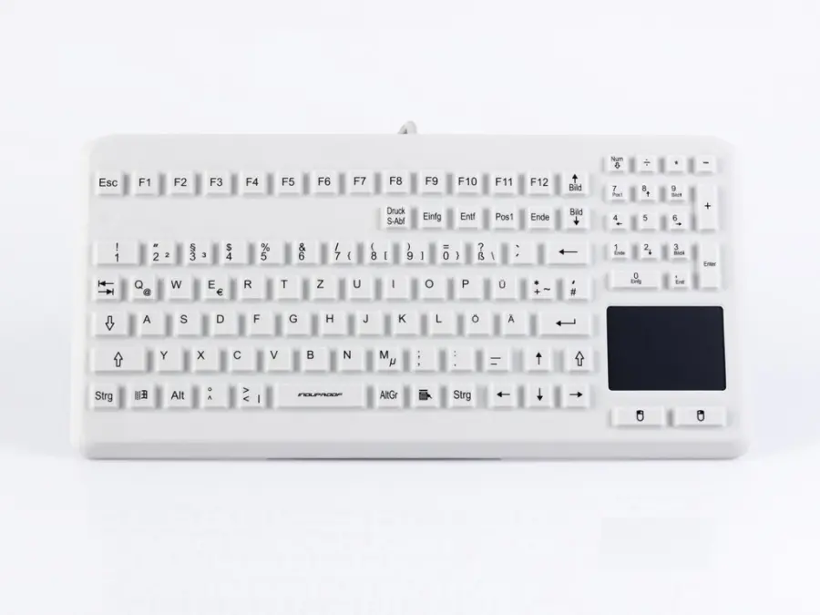 SANITIZABLE INDUPROOF ADVANCED SILICONE KEYBOARD WITH DIN EN 60601-1:2007 CERTIFICATION AND INTEGRATED TOUCHPAD DIN EN 60601 certified product (electrical safety of medical devices) Integrated touchpad VESA mounting (75 x 75 mm) Complete dust and