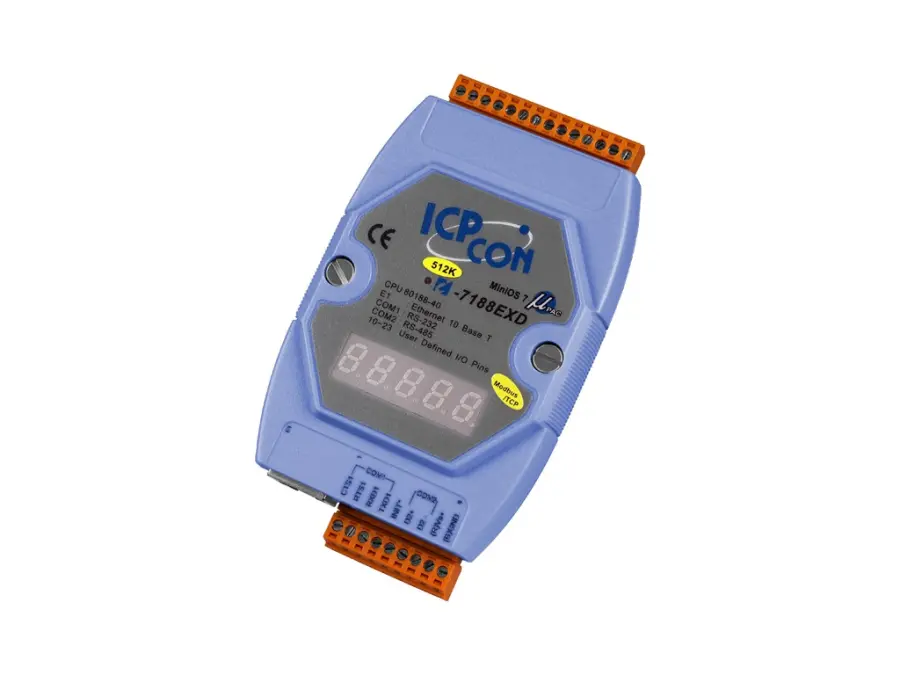 Modbus/TCP Internet/Ethernet Vestavěný Internet/Ethernet Controller s jedním ethernetovým portem, jedním portem RS-232, jedním RS-485 / 512K SRAM / 512K FLASH a několika volitelnými uživatelsky definovanými I/O s LED displejem.
