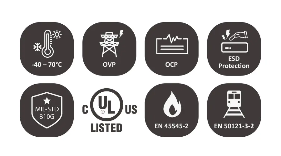 Kromě funkcí, jako je široká teplotní ochrana (-40 - 70 °C), široké vstupní napětí (9 - 48 VDC), ochrana proti přepětí, nadproudu a ESD, splňuje také americkou vojenskou normu MIL-STD-810G pro ochranu proti vibracím způsobeným nárazem.