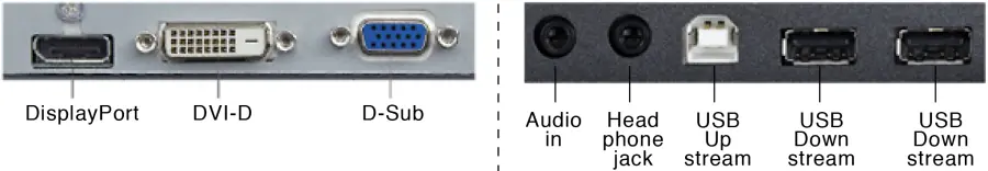 Monitor je vybaven třemi vstupy: DisplayPort, DVI-D a VGA. Pro pohodlné připojení periferií jsou k dispozici také dvě USB typu A a 3,5mm jack pro připojení sluchátek.