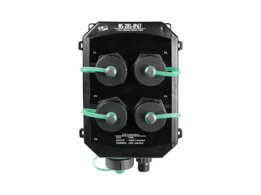 Průmyslový 5portový neřízený ethernetový přepínač IP67 s PoE Obsahuje zástrčku RJ45 IP67 x 5, napájecí zástrčku IP67 x 1, krytku s poutkem x 5 (RoHS)