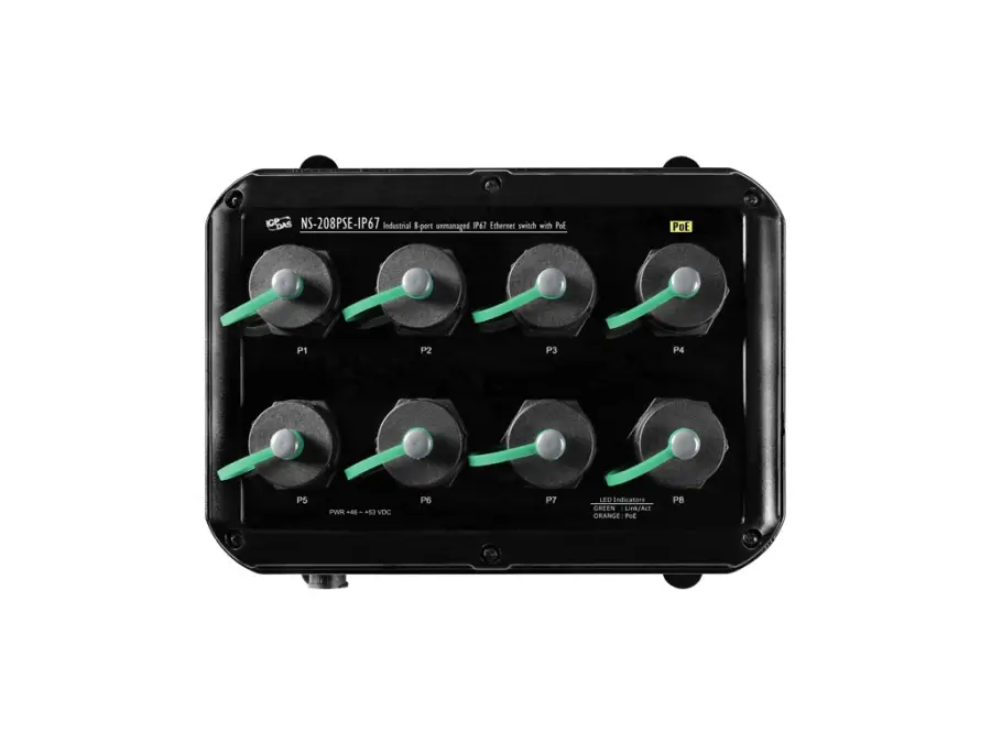 Průmyslový 8portový neřízený ethernetový přepínač s krytím IP67 a PoE Obsahuje zástrčku RJ-45 IP67 x 8, napájecí zástrčku IP67 x 1, krytku s poutkem x 8 (RoHS)