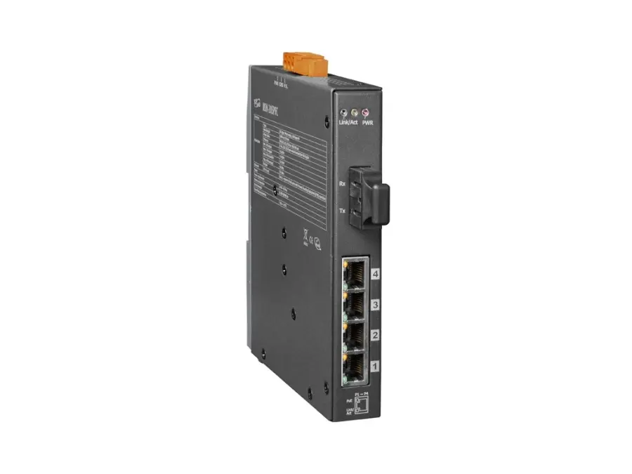 Vícemódový, SC konektor, 4 porty 10/100 Mb/s PoE (PSE) s 1 portem pro optická vlákna a vstupním přepínačem 24 VDC; kovové pouzdro (RoHS)