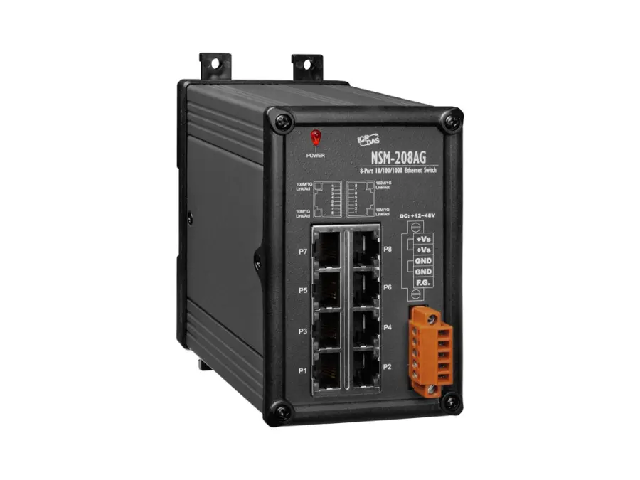 Neřízený 8portový ethernetový přepínač 10/100/1000 Base-T s napájecím vstupem +12 VDC ~ +48 VDC, kovový kryt (RoHS)