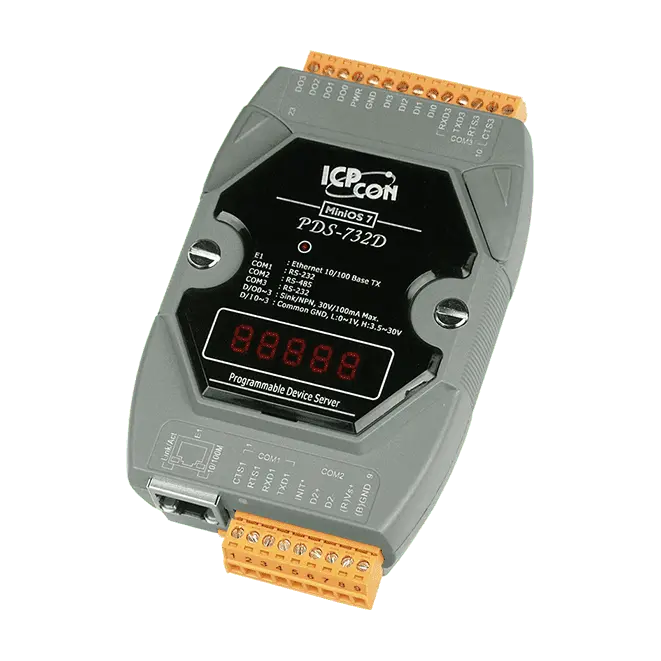 Programmable (2x RS-232 and 1x RS-485) Serial-to-Ethernet Device Server with 4x DI, 4x DO and LED Display (RoHS) Includes CA-0910 Cable