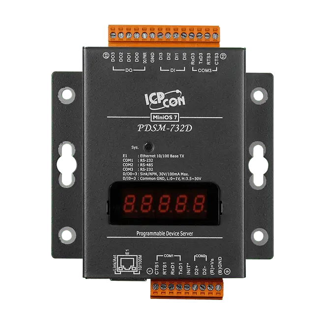 Programmable (2x RS-232 and 1x RS-485) Serial-to-Ethernet Device Server with 4x DI, 4x DO and LED Display (Metal Case) (RoHS) Includes CA-0910 Cable