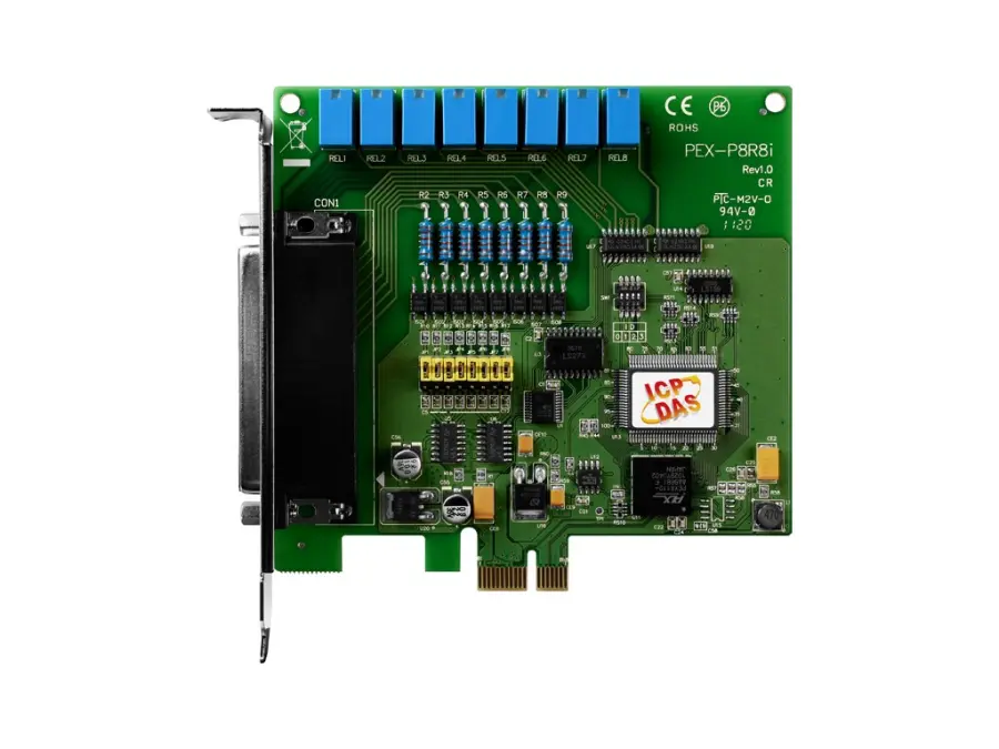 PCI Express x1, 8kanálový izolovaný digitální vstup, 8kanálový reléový výstup Obsahuje jeden konektor CA-4002 D-Sub.