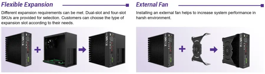 Díky modulárnímu designu lze systém snadno rozšířit o další I/O moduly (např. 8× PoE LAN) nebo grafické karty (včetně NVIDIA RTX 3060) pomocí volitelných rozšiřujících šasi. Je k dispozici s podporou pro až 6 slotů PCIe, včetně napájení pro náročnější GPU a akcelerační karty.