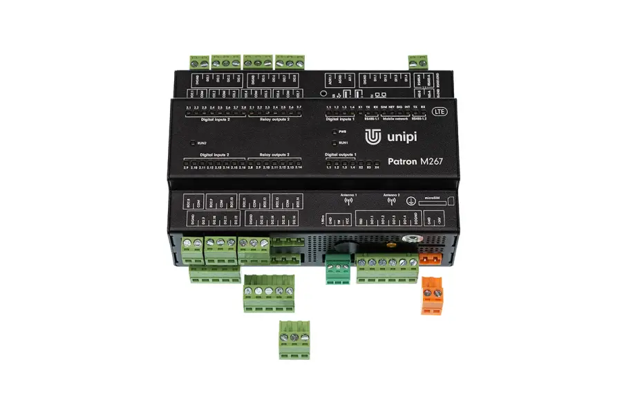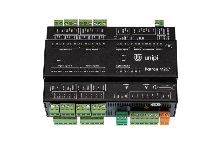Programovatelný logický kontrolér (PLC) a převodník Unipi Patron M267. SW řešení Mode-RED a Mervis.